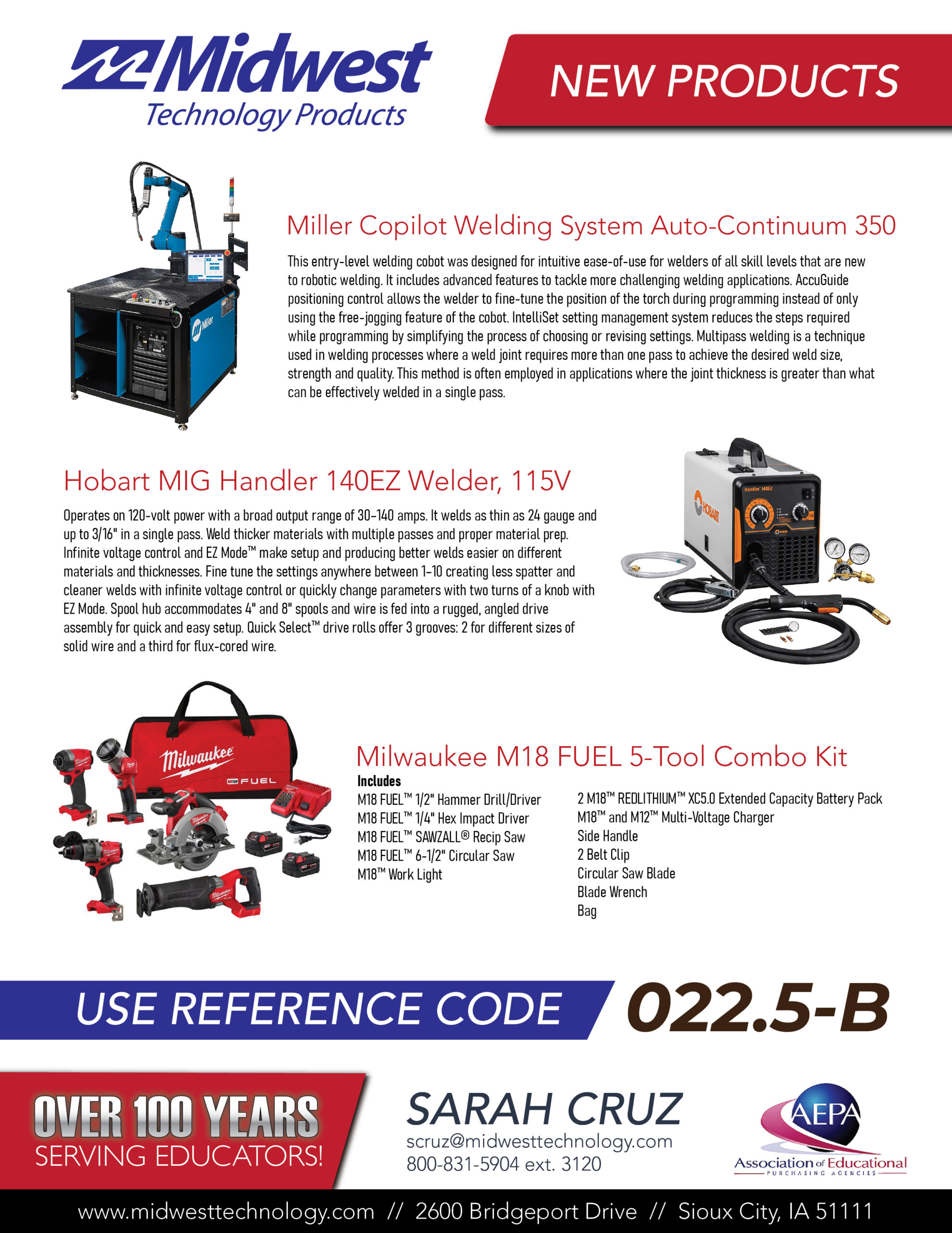 For example, find not only power saws, pressure washers, drafting tables, voltage meters, compressors, and automotive jacks, but also 3-D printers, air brushes, science tables, and STEM supplies. Where would you go for an aerial drone for your schools or corp yard? Yes, Midwest Technology Products.